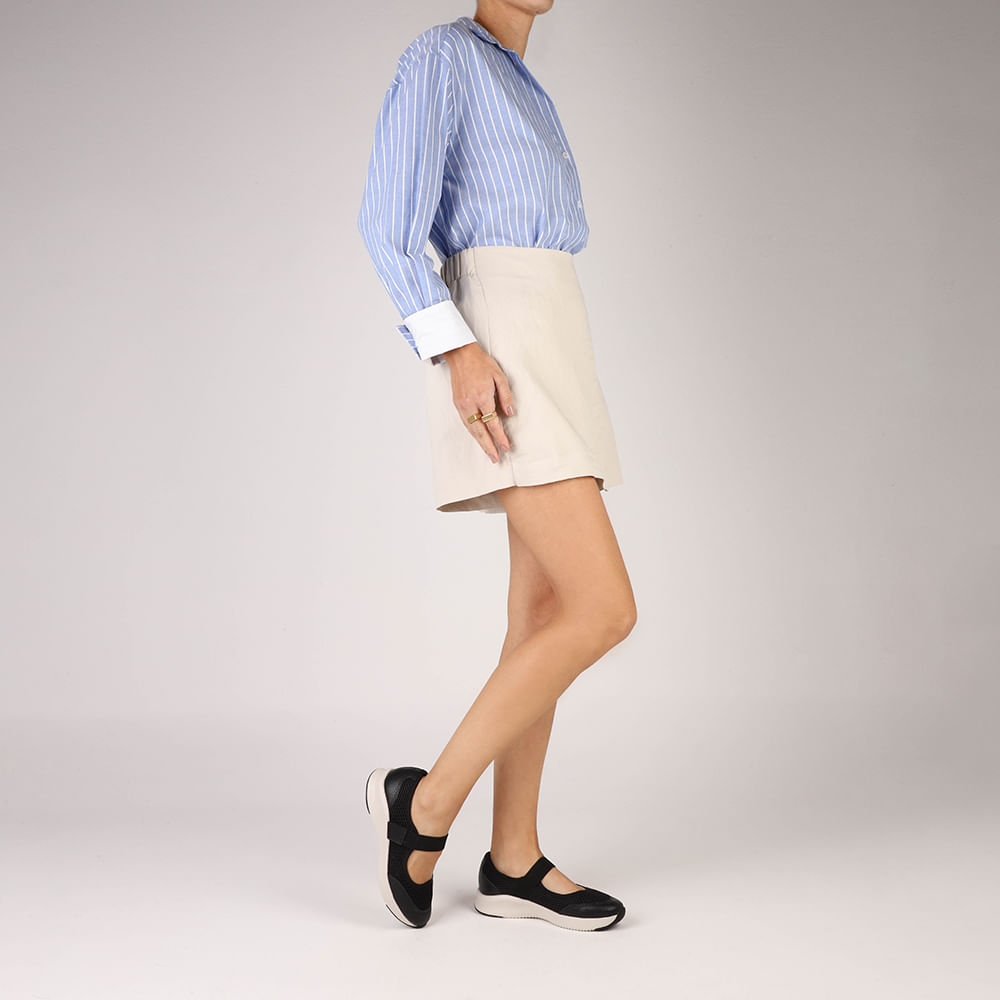 Tênis cabedal em couro e tecido na cor preto. A palmilha Nuvem proporciona conforto imediato e maciez excepcionais, com design ergon ômico que inclui pontos de acupuntura e um sistema de amortecimento eficaz, garantindo versatilidade e prevenção de dores nos pés.