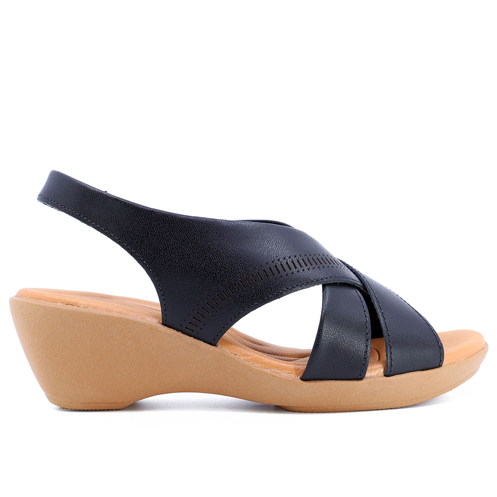 Sandália salto anabela em couro napa valise na cor preto e detalhe laser. O modelo possui tecnologia Calce Fácil, com modelagem inteligente em adaptar o calçado a ergonomia dos pés.