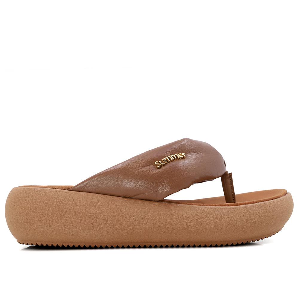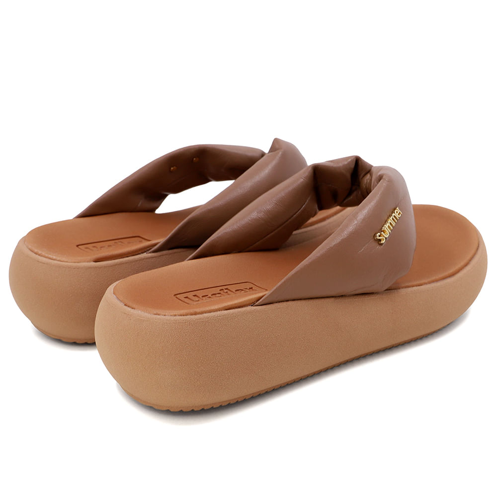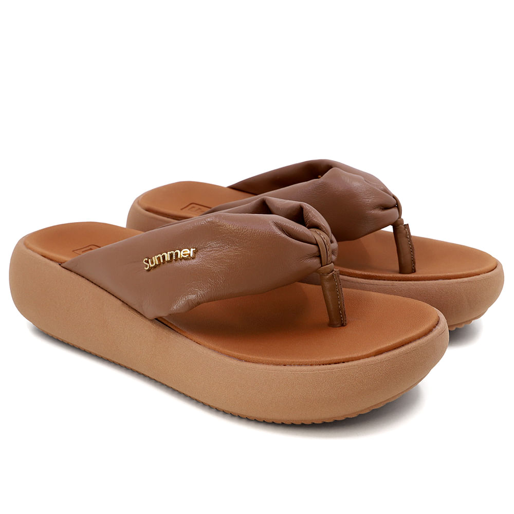 Chinelo plataforma, cabedal em vegetal e napa acetinado na cor camel. O modelo possui tecnologia Sola+Conforto, um solado com altura entre 2 e 4 cm de salto que distribui o peso corporal na pisada.