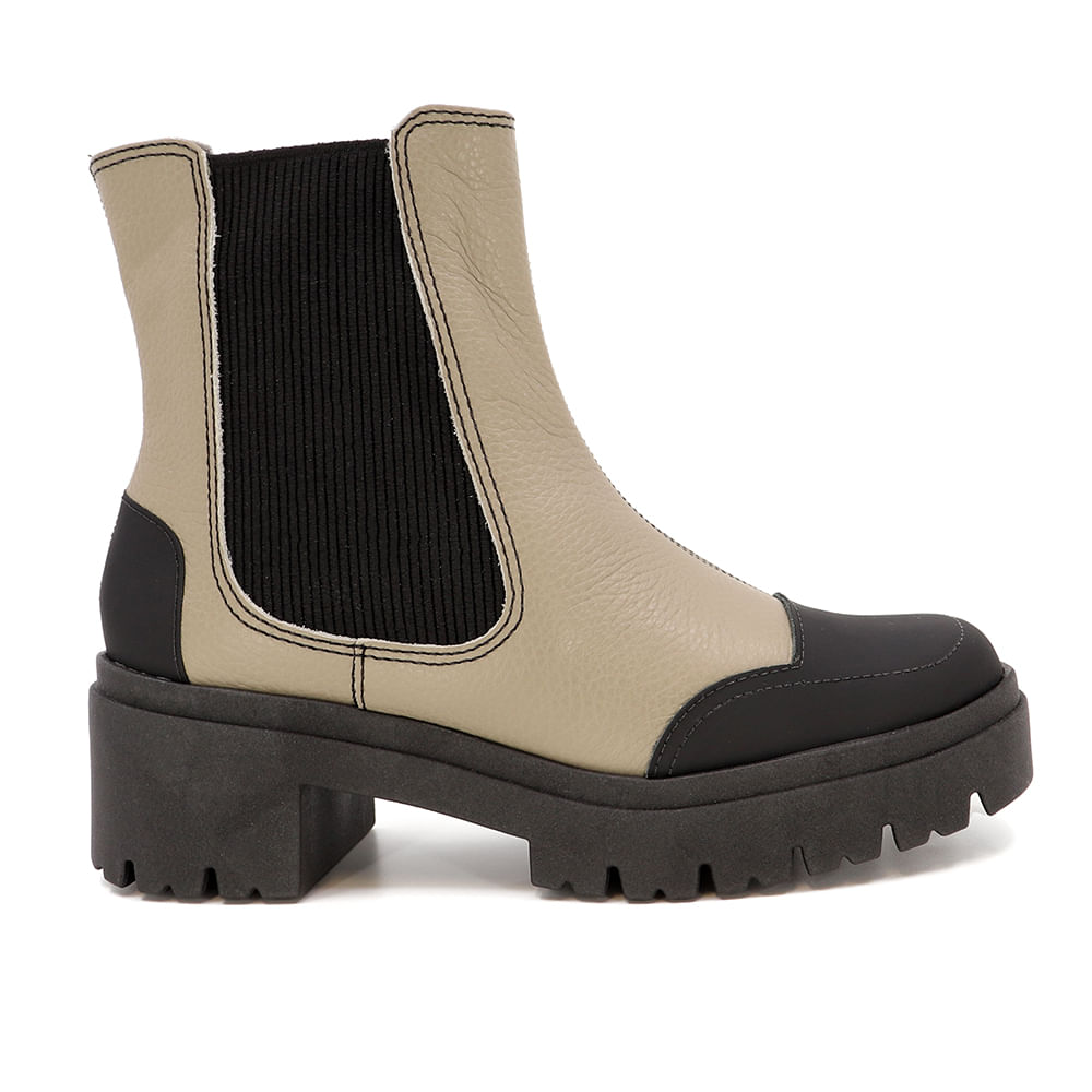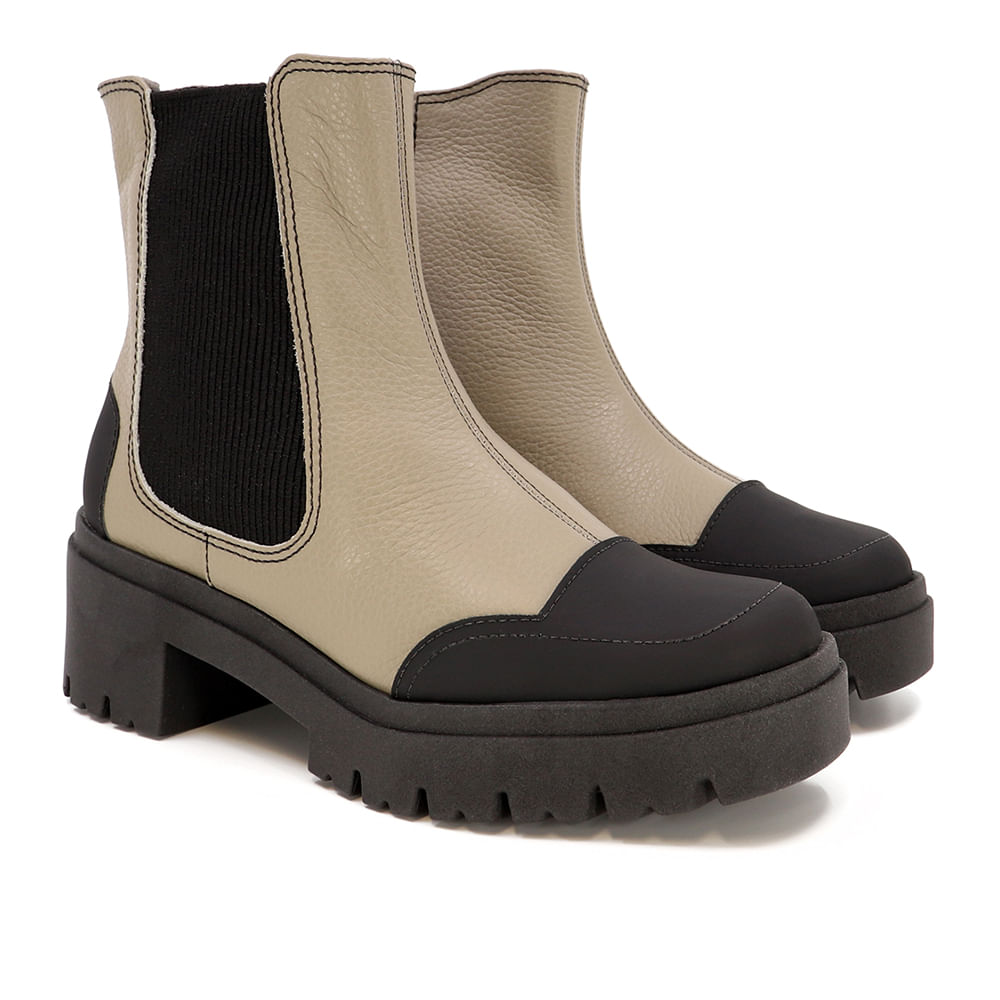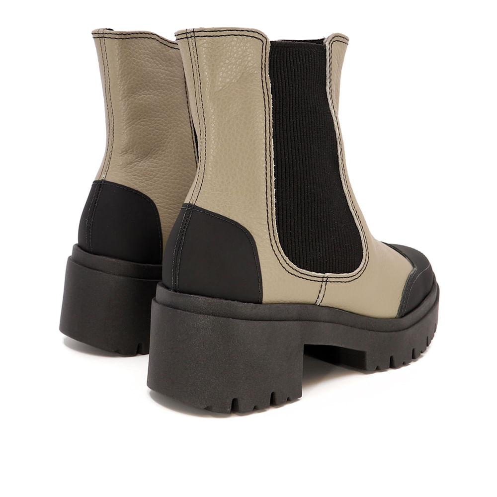 Bota plataforma cabedal em couro relax catalano na cor taupe e detalhes em ecofusion preto fechamento em ziper. O modelo possui tecnologia Sola+Conforto, um solado com altura entre 2 e 4cm de salto que distribui o peso corporal na pisada.