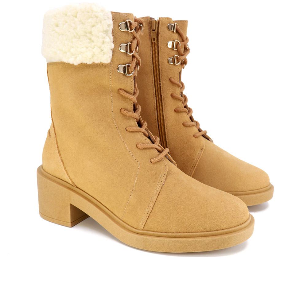 Bota cano médio salto bloco, cabedal em couro camurça na cor amêndoa detalhes em pelo fechamento em ziper. O modelo possui tecnologia +Bem-Estar, com espumas posicionadas em pontos estratégicos na palmilha garantindo conforto e suavidade na pisada.