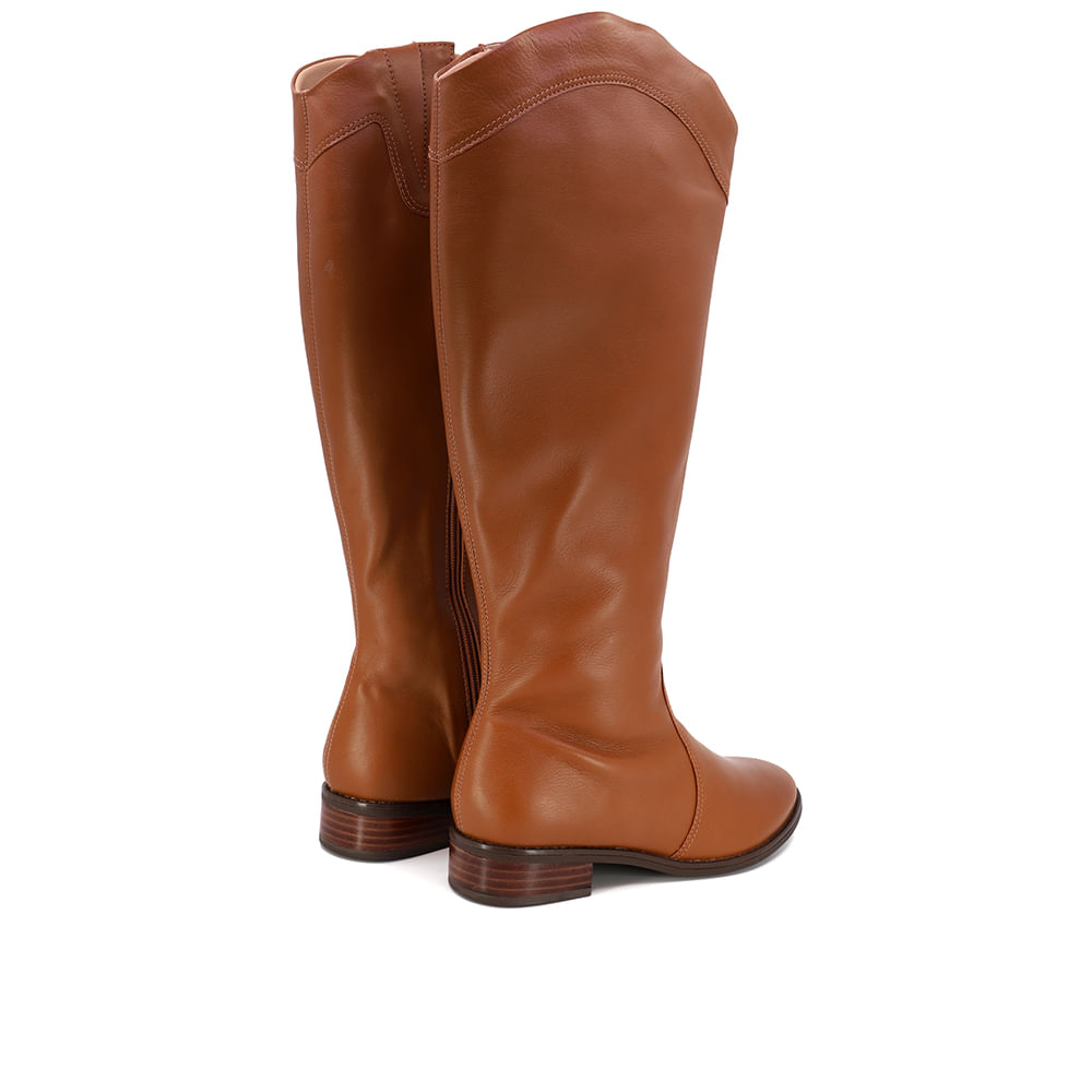 Bota salto bloco cano alto cabedal em couro napa bota na cor canela fechamento em ziper. O modelo possui tecnologia +Bem-Estar, com espumas posicionadas em pontos estratégicos na palmilha garantindo conforto e suavidade na pisada.