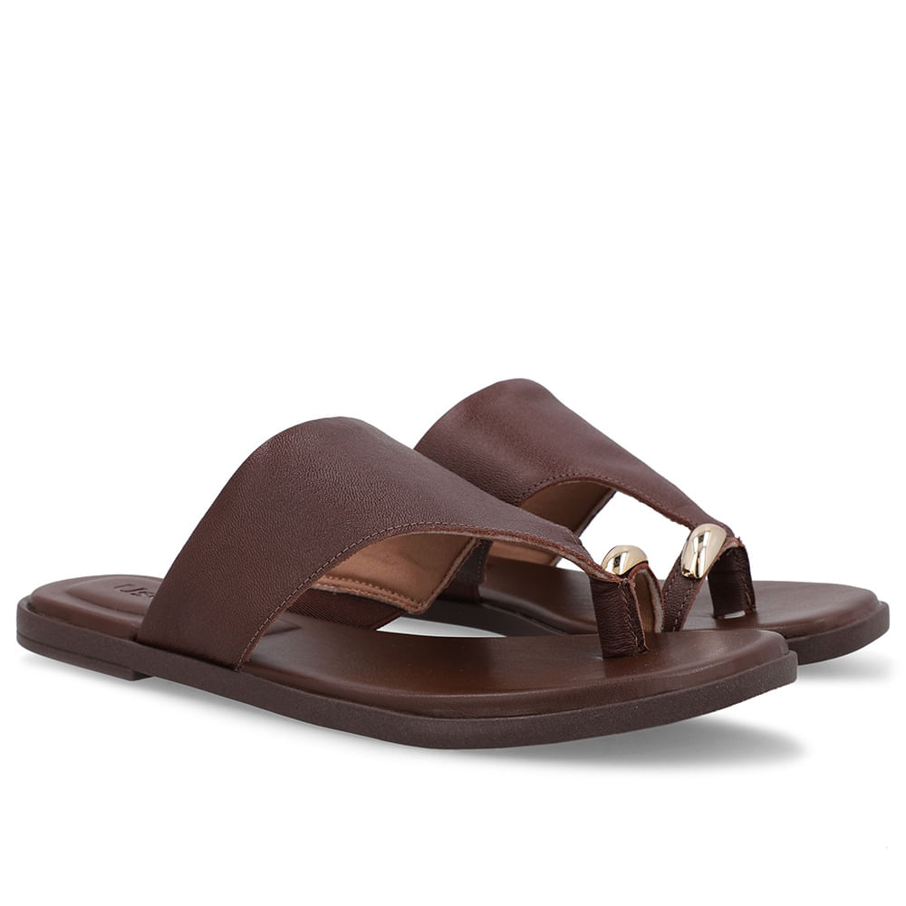 Rasteira em couro napa new milano na cor pinhão. O modelo possui tecnologia Couro, com conforto, maciez e durabilidade.