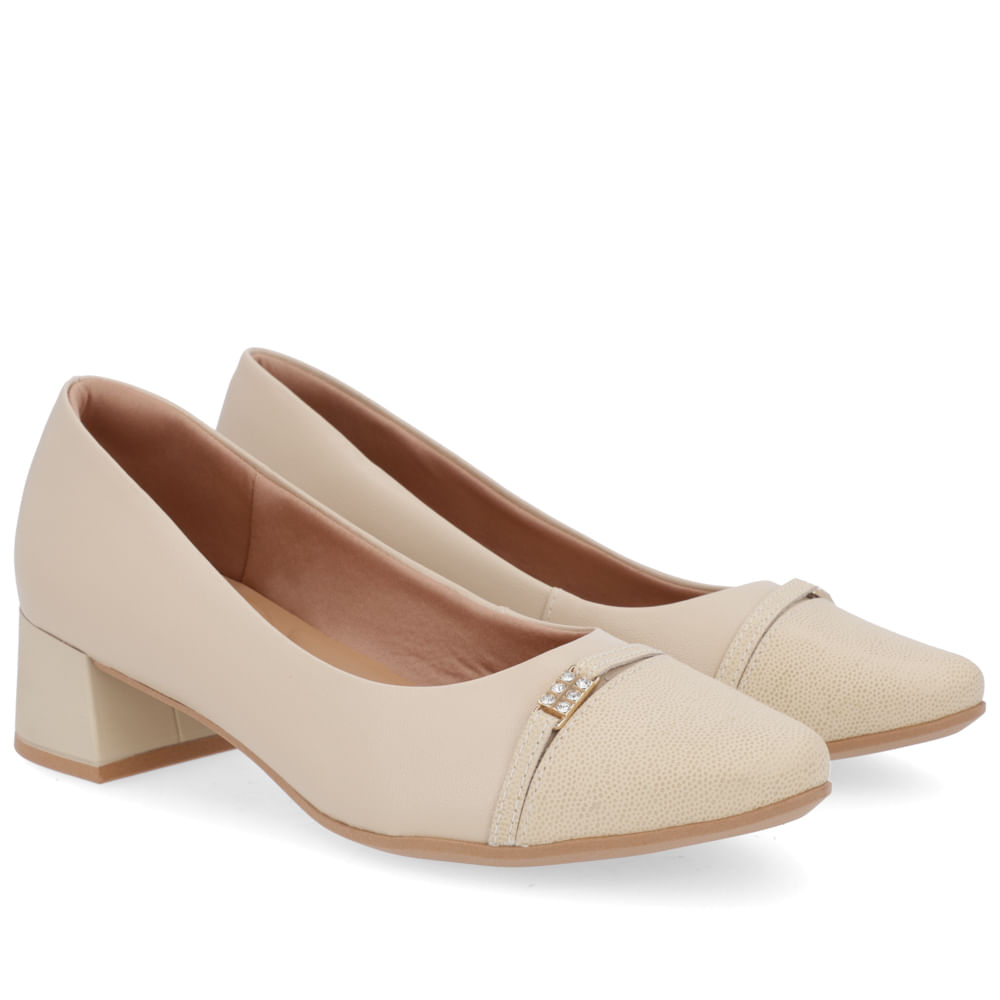 Scarpin salto bloco cabedal em couro arraia e napa valise na cor vanilla. O modelo possui tecnologia +Bem-Estar, com espumas posicionadas em pontos estratégicos na palmilha garantindo conforto e suavidade na pisada.