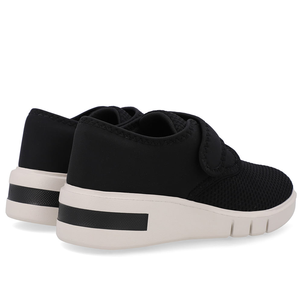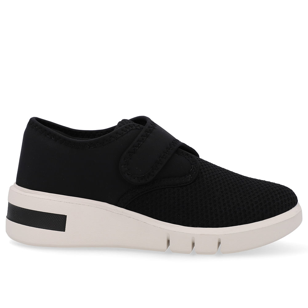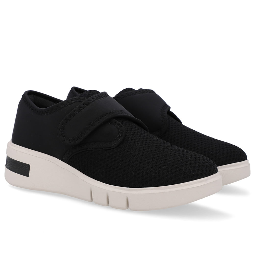 Tênis cabedal em tecido elástano na cor preta. O modelo possui tecnologia Pés Sensíveis, que através da redução de dobras e costuras internas acomoda confortavelmente os pés, pela sua construção ter materiais de rápida absorção de suor, hidratação e propriedades a ntibacterianas e antifúngicas.