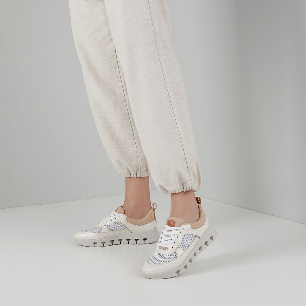 Tênis cabedal em couro floater metal color e tecido nas cores marfim e branco. Adapta-se totalmente à anatomia do pé da nossa consumidora, abraçando o caminhar e absorvendo os impactos do dia a dia com muito mais conforto.