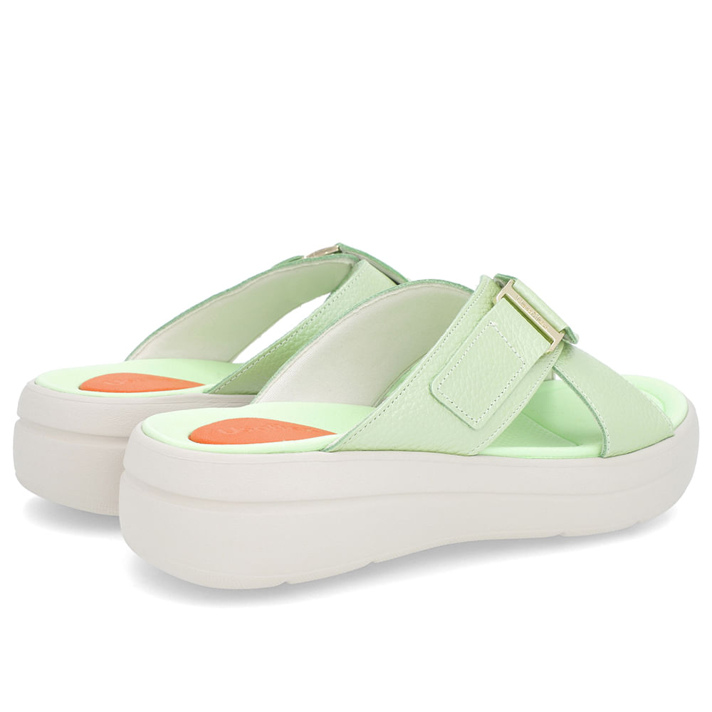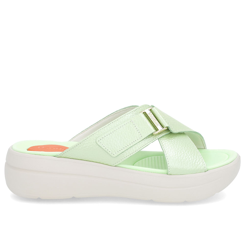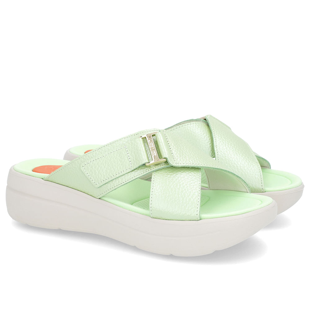 Tamanco em couro floater metal color na cor verde mentolado.O modelo possui tecnologia Amortecedor, com uma gota de borracha em sua palmilha para amortecer o impacto da pisada.