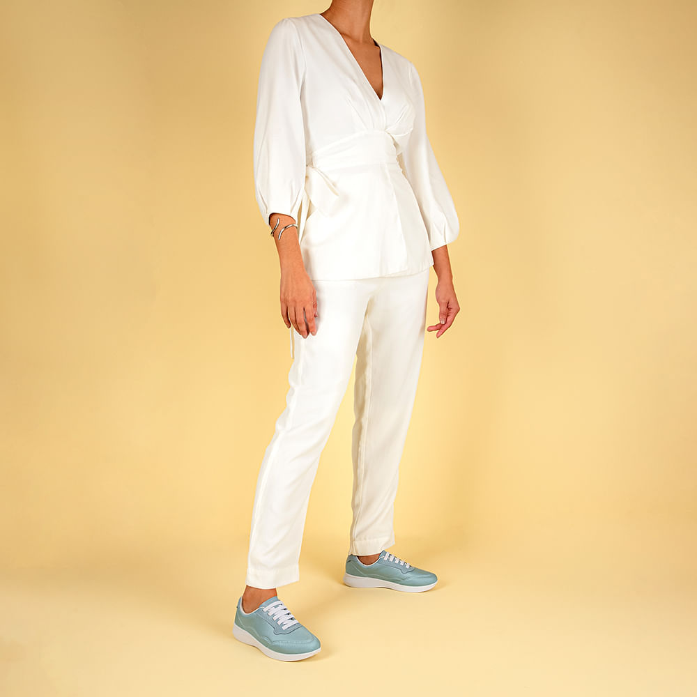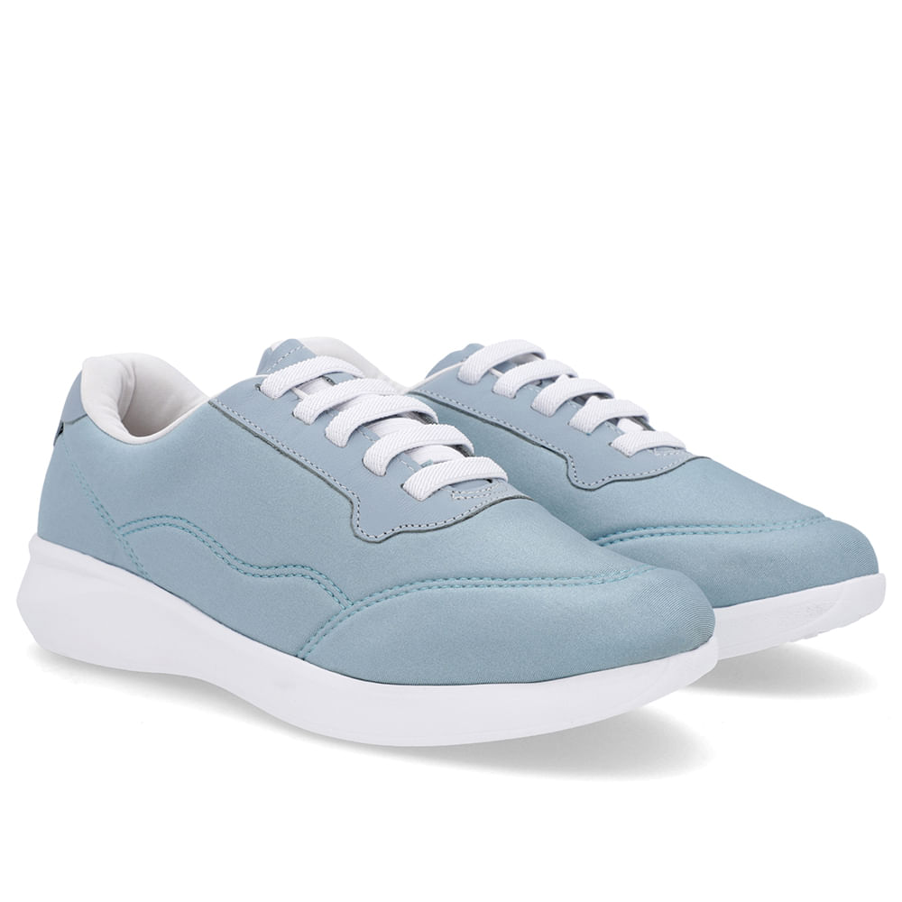 Tênis cabedal em tecido elastano na cor light blue. O modelo possui tecnologia Cuidado Intensivo, contendo palmilha com anatomia especial que alivia dores e desconfortos na sola do pé, causadas principalmente por inflamações como fascite plantar.