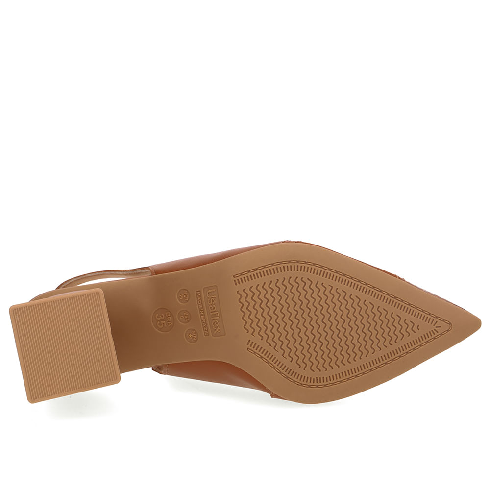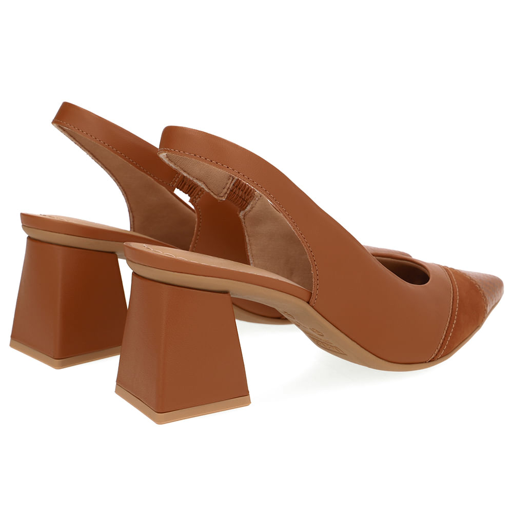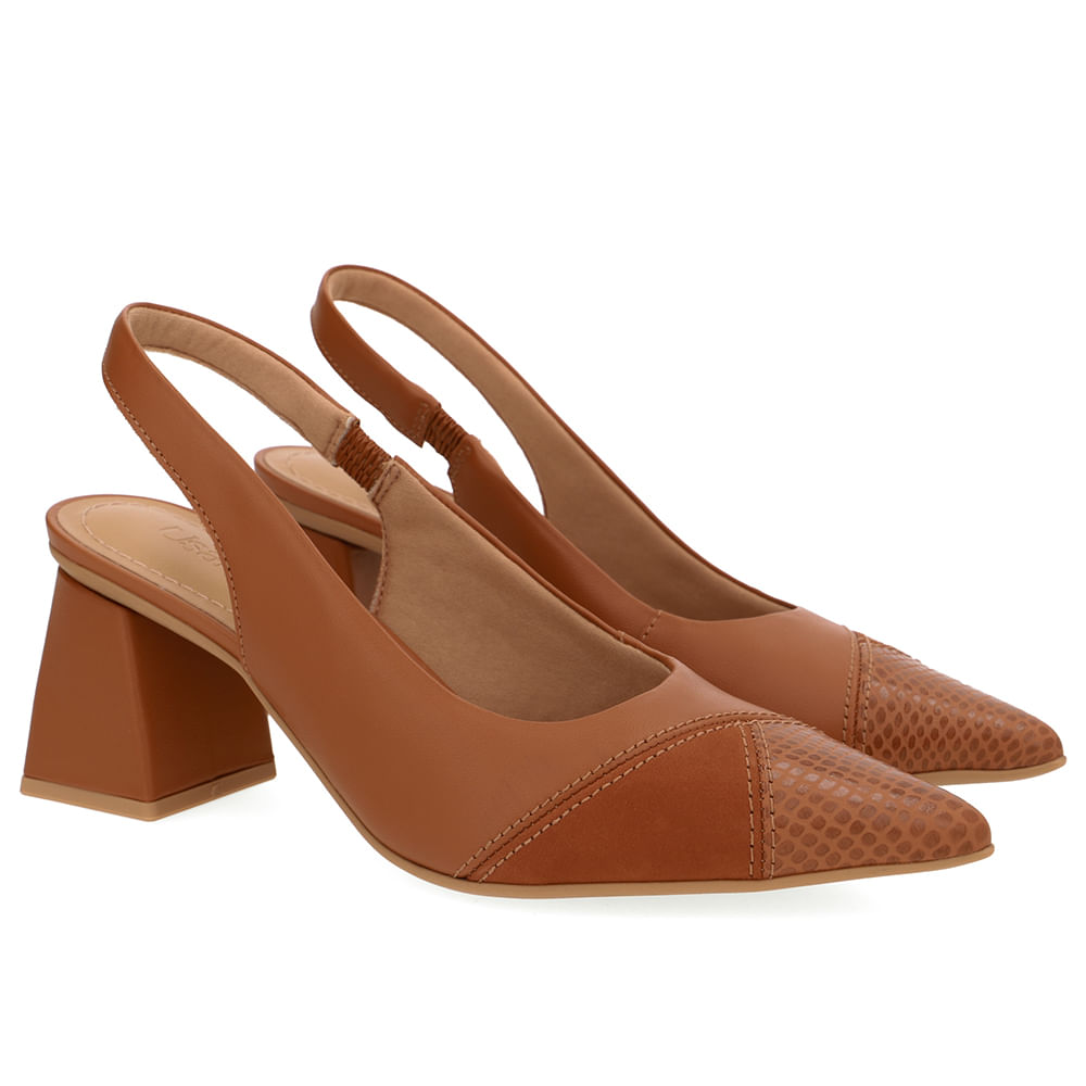 Slingback cabedal em couro new escama, nobuck e napa valise na cor doce de leite. Design anatômico pensado para tornar o momento de calçar mais fácil e prático.