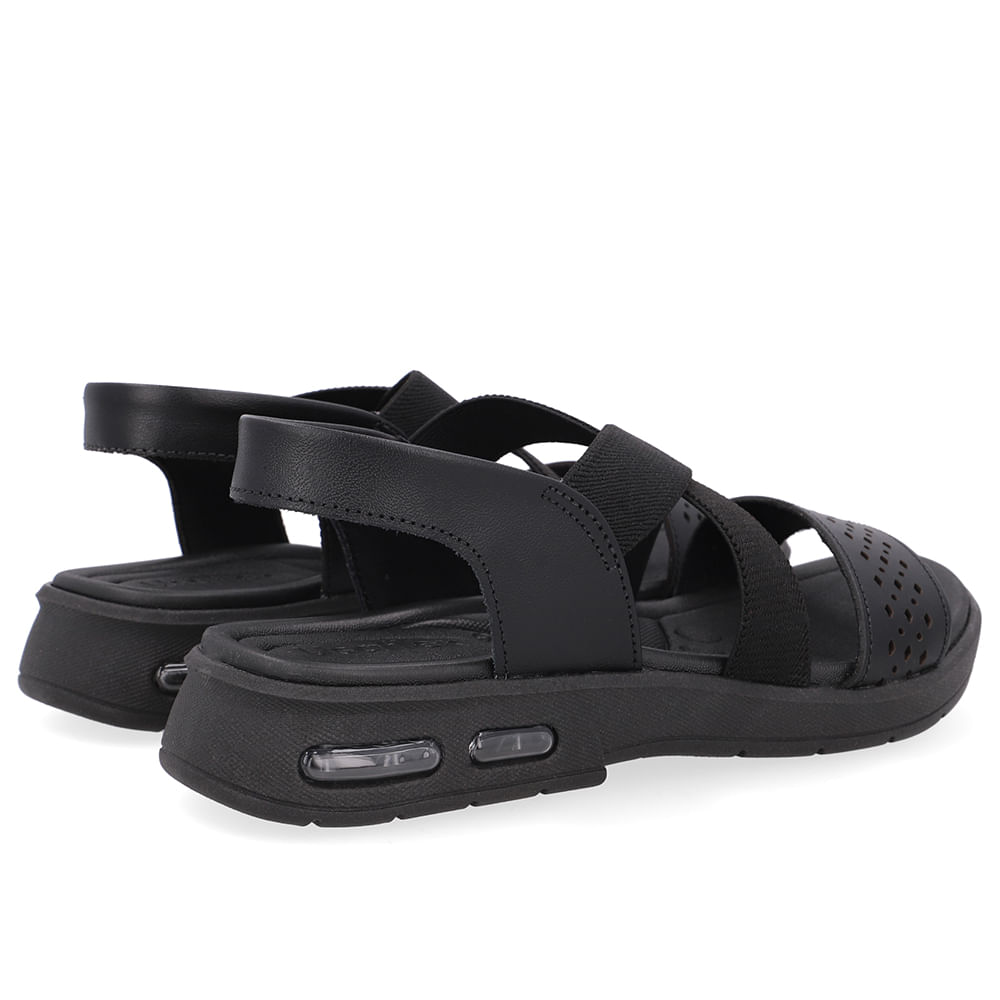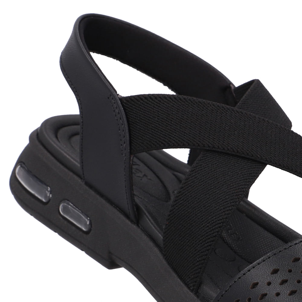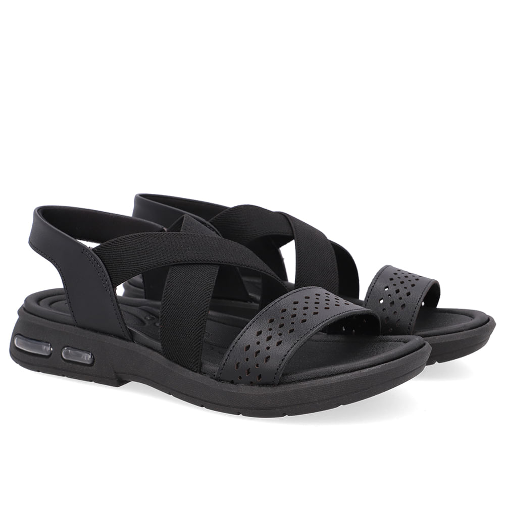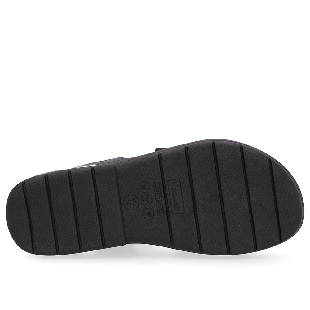Sandália cabedal em couro napa valise e elástico na cor preto. a tecnologia arcoflex oferece estrutura que preenche a região do arco plantar, auxiliando no alívio de possíveis dores nas regiões dos pés, tornozelos e pernas.