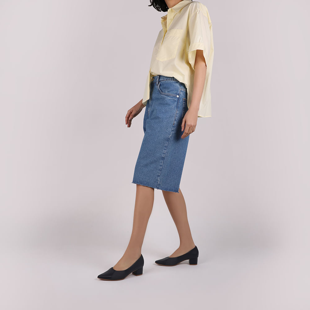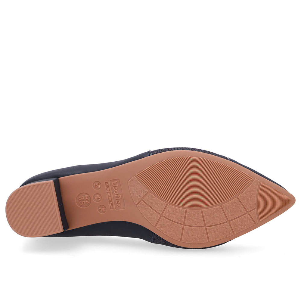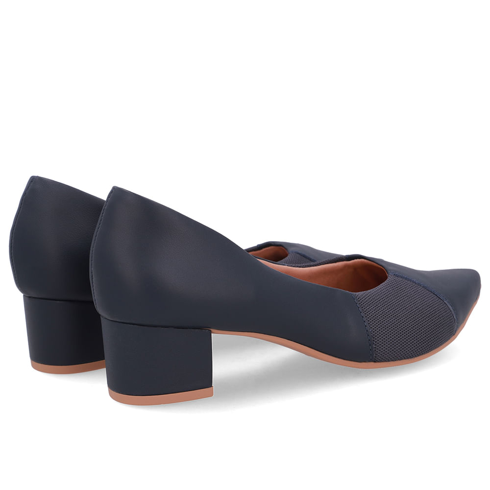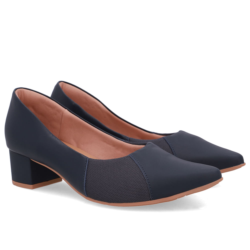 Scarpin cabedal em couro napa valise e tecido na cor new blue. O modelo possui tecnologia Joanetes, que alivia o desconforto da região, garantindo suavidade na pisada por usufruir de materiais moldáveis nos pés.